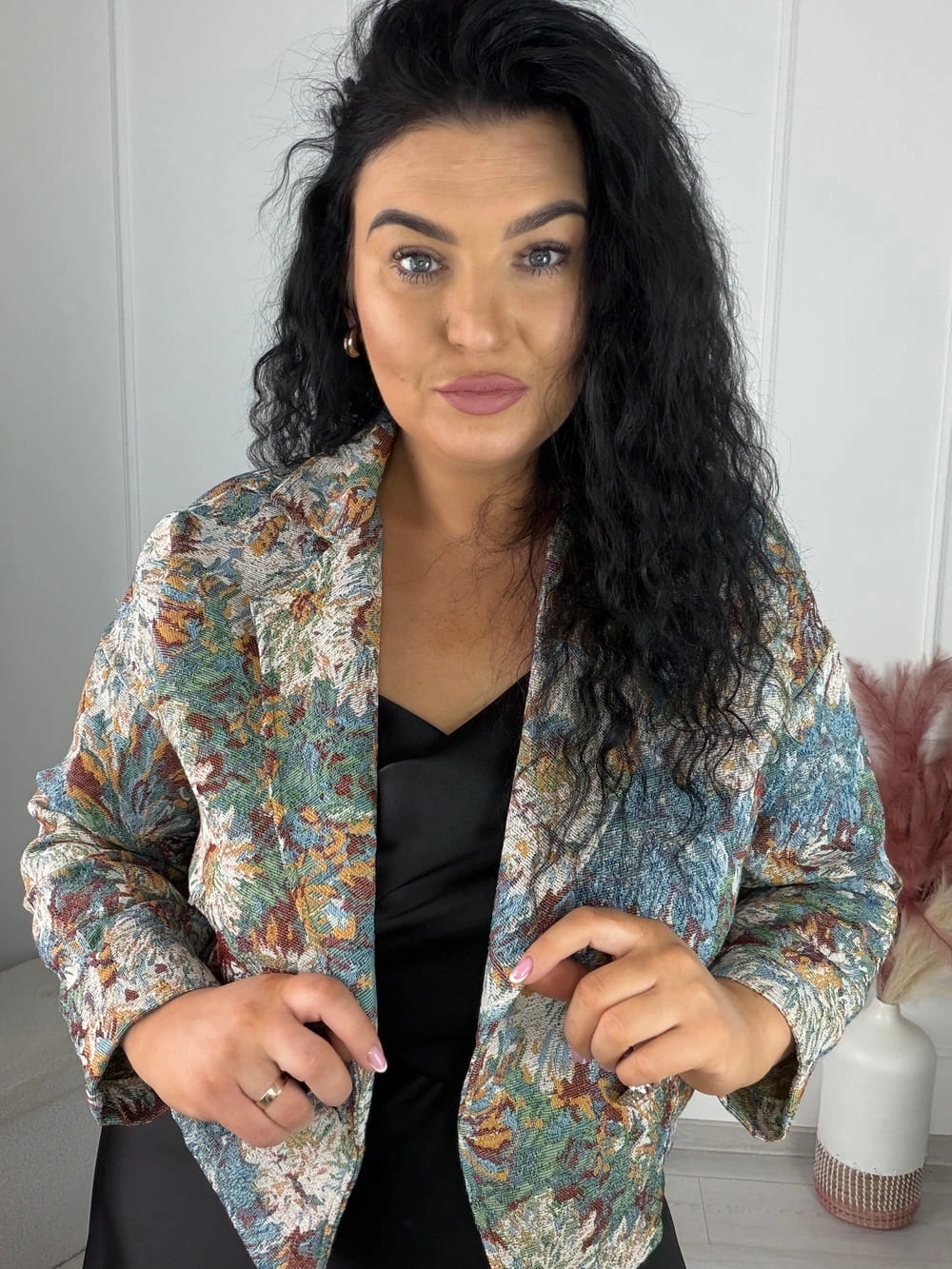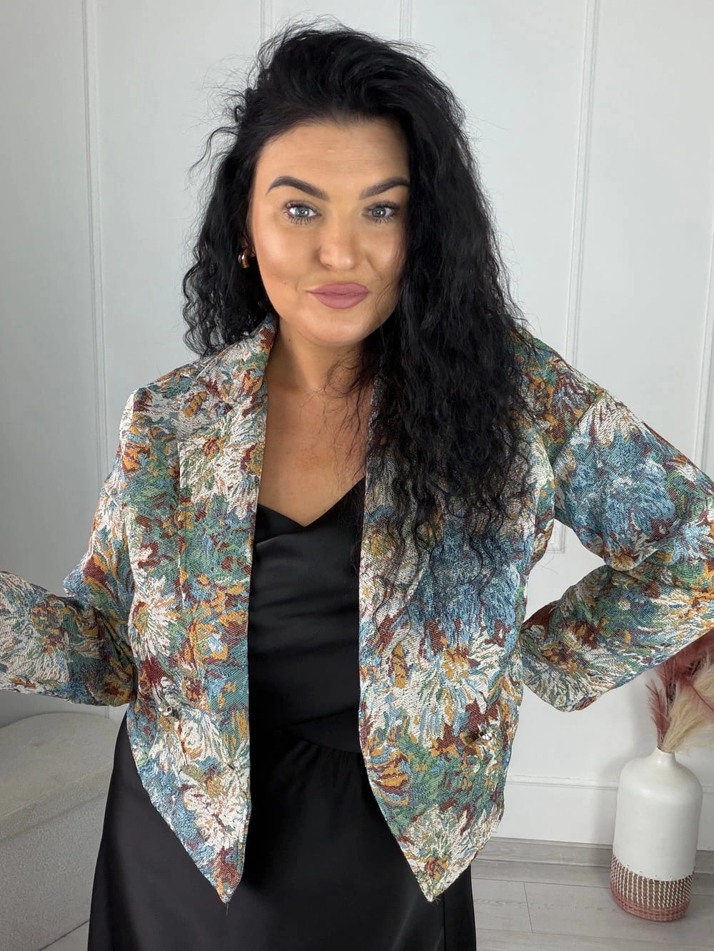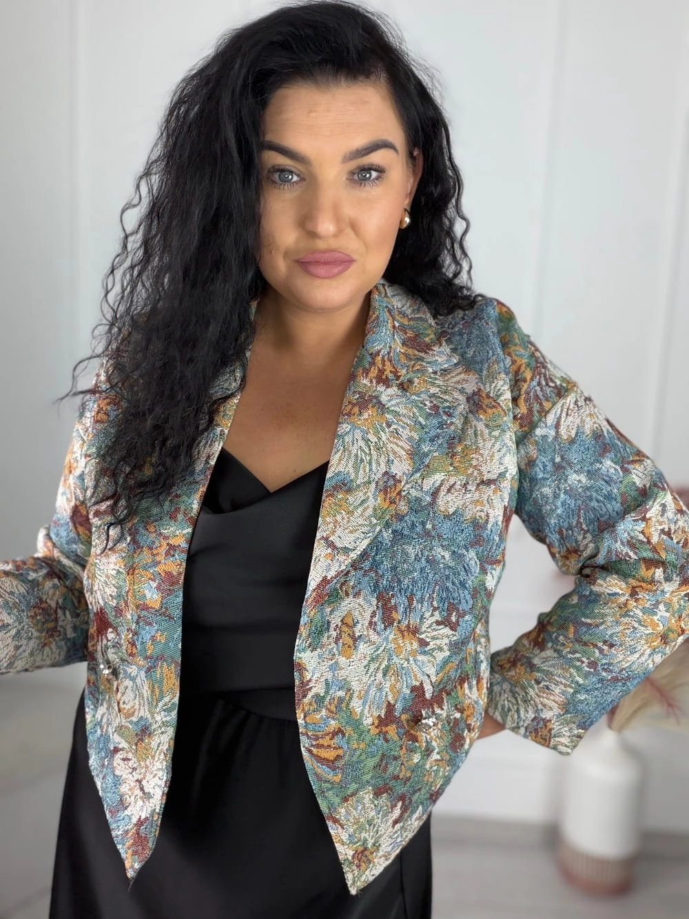 Krótka marynarka o wyjątkowej strukturze tkaniny i artystycznym princie. Lekka, wygodna i efektowna – idealna, gdy chcesz podkreślić styl
