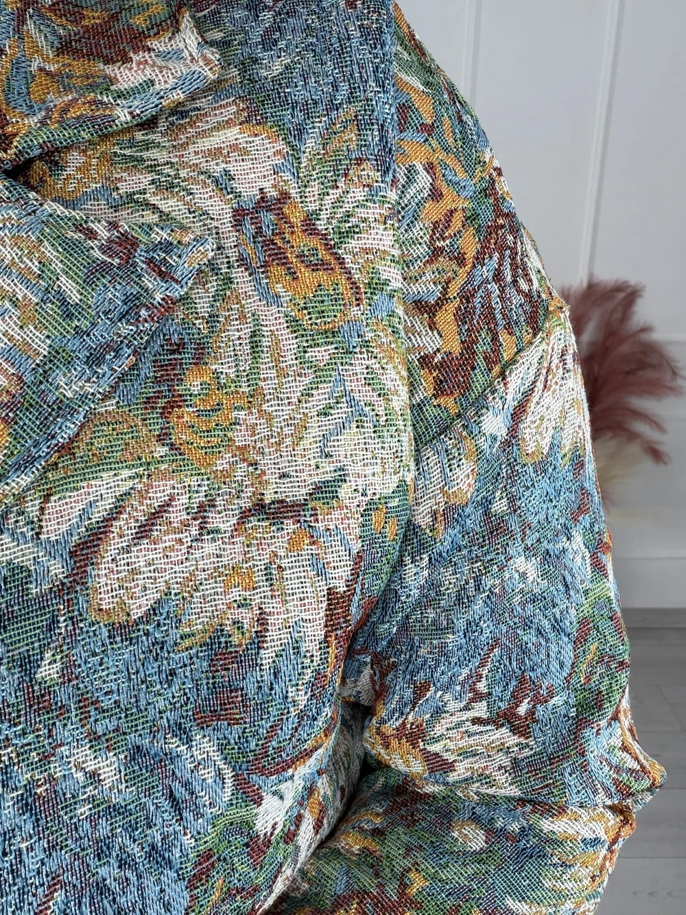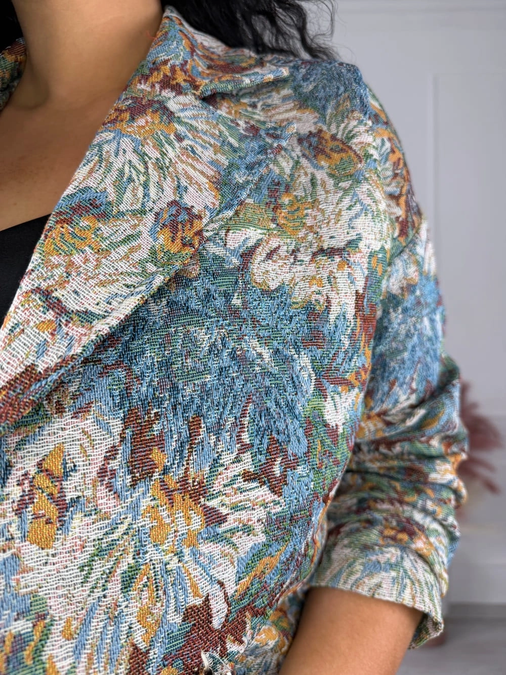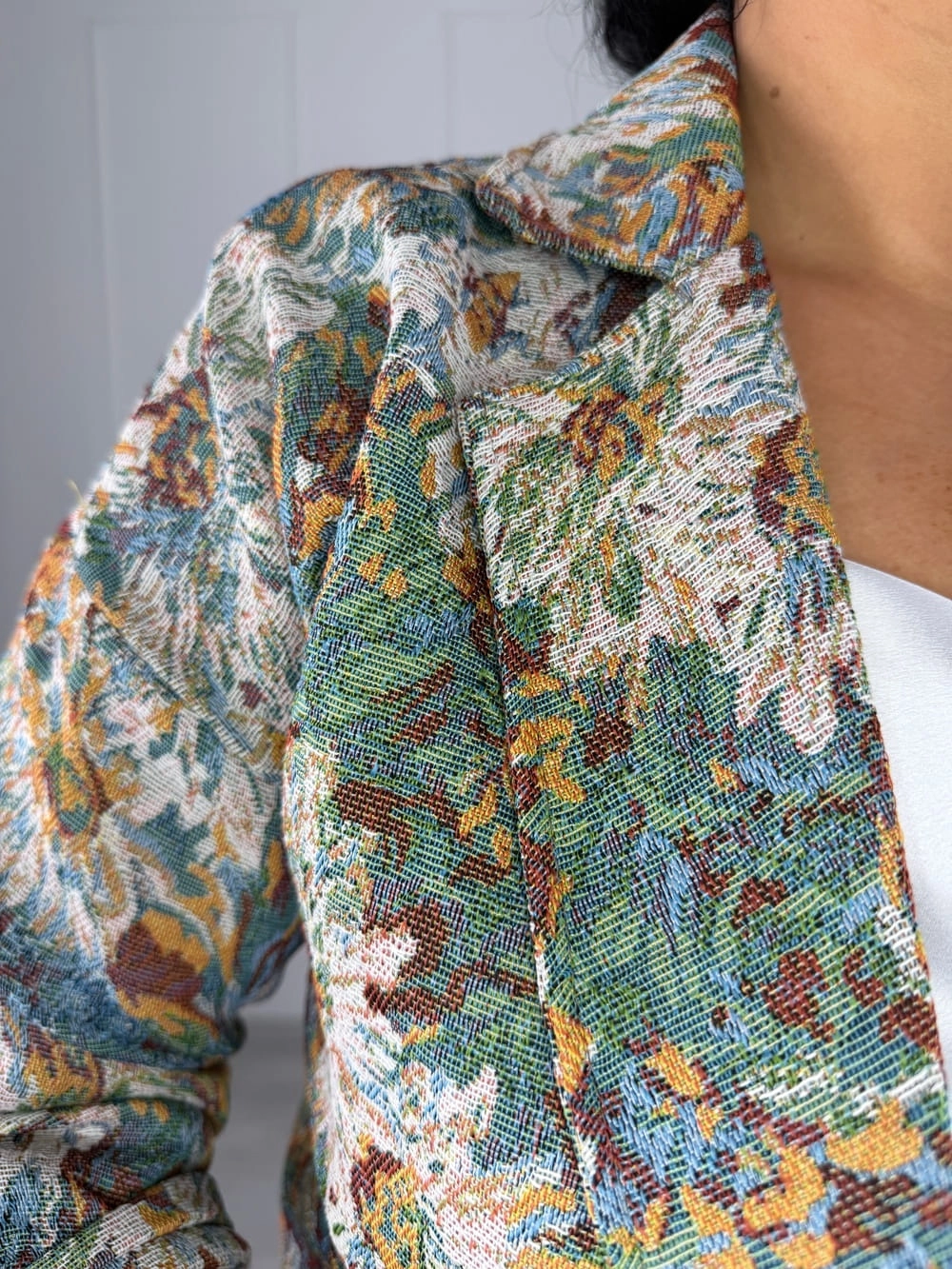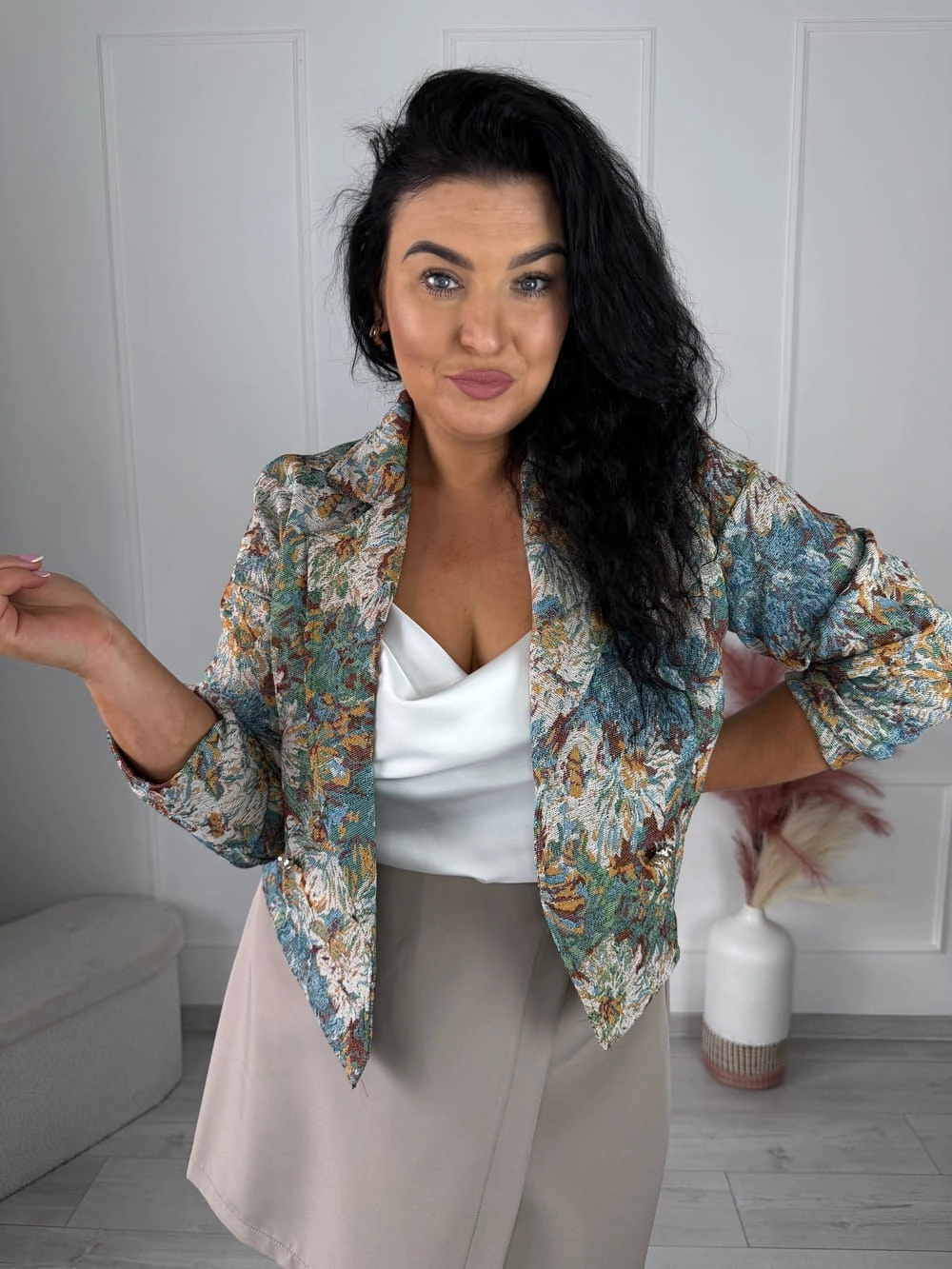 Krótka marynarka o wyjątkowej strukturze tkaniny i artystycznym princie. Lekka, wygodna i efektowna – idealna, gdy chcesz podkreślić styl